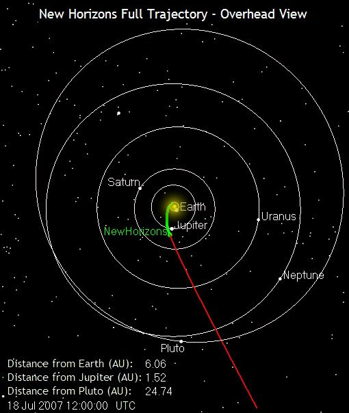18 .7. 2007. Grafikoni koje slede pokazuju simulirani trenutni položaj letilice „New Horizonsa“ u solarnom sistemu. Sve je urađeno softverom „Satellite Tool Kit“ (STK). Klikni ovde i vidi podatke o dosadašnjem prolasku „New Horizonsa“ pored svake planete, počevši od našeg Meseca. Trenutna pozicijaSlika pokazuje trenutni položaj „New Horizonsa“. Zelena linija pokazuje pređeni put ove letilice od lansiranja; crvena pokazuje predstojeći put ka Plutonovom sistemu, i dalje. Ucrtane su i zvezde 12. magnitude i sjajnije koje se vide iz date perspektive. Šta je to A.J.? Grafika na slici prikazuje udaljenost „New Horizonsa“ od Zemlje, Jupitera i Plutona u A.J. – astronomskim jedinicama. Jedna A.J. iznosi prosečnu udaljenost između Zemlje i Sunca, oko 149,6 miliona kilometara. Ovde se nalazi zgodan kalkulator http://pluto.jhualp.edu/mission/whereis_nh.php Heliocentrična brzina. Na trenutnoj pozicije se očitava i heliocentrična brzina letilice – brzinom u odnosu na Sunce – u kilometrima u sekundi. Jedan kilometar u sekundi je jednak 3.600 km/h. Šta je to 2002 JF56? 13. juna 2006. „New Horizons“ je proleteo na 102.000 km od asteroida 2002 JF56, malog, relativno nepoznatog sveta manjeg od 5 km u prečniku. Na toj udaljenosti, asteroid je bio toliko mali da Ralph kamera ga je jedva uočila. (Kamera velike rezolucije LORRI nije otvarala svoj poklopac sve do avgusta, da bi zaštitila osetljivu aparaturu od slučajnog uticaja Sunca. Tako se desilo da iako bi LORRI dala bolje slike, ipak nije korišćena iz sigurnosnih razloga.) Ali i taj „bliski susret“ sa 2002 JF56 je bio vrlo koristan za „New Horizons“. Naučni tim je uspešno testirao optičku navigaciju Ralpha i mogućnosti praćenja mete, što je bilo od koristi kada je letilica stigla do Jupitera, a i biće od velike koristi kada letilica stigne do Plutonovog sistema. Od januara 2007. godine, asteroid je u čast vodeće uloge Laboratorije za primenjenu fiziku Univerziteta Johns Hopkins u vođenju misije, preimenovan u „APL“. Kompletna putanja: Pogled odozgoKompletna putanja: Pogled sa strane