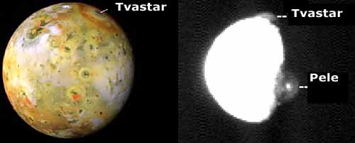 Erupcija iz vulkana Tvastar u obliku kišobrana. Crveni oreol je i dalje prisutan oko vulkanskog grotla. Desno: kada se poveća kontrast i osvetljenje erupcija postaje jasno vidljiva