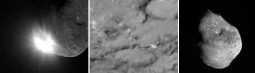 Konačno je objavljena jedna fotografija HRI kamere. To je slika sa leve strane gde se vidi izbačeni materijal 13 sekundi posle sudara. Slike u sredini i desno su sa impaktora. Malo je do sada bilo reči o geološkim formacijama na samoj kometi. Čekaju se nove slike i bolji detalji. Moguće je da smo uhvatili gejzire na delu jer je Tempel 1 zadnjih dana bio poprilično aktivan. 14:00 CEST