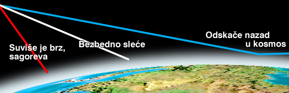 Istu tu ideju možemo da iskoristimo i za put svemirskog broda kroz Zemljinu atmosferu. Sve više vazduha u koji brod uranja usporava ga, a trenje ga i zagreva (naglo usporavanje može i da usmrti kosmonaute). Zato je najbezbednija ona putanja koja uvodi letilicu u plitko, postepeno uranjanje u atmosferu, dajući joj vremena da se bar donekle hladi od prevelikog trenja sve gušćeg vazduha. Ako bi letilica suviše naglo i duboko uletela u guste slojeve atmosfere, postala bi previše vrela; a opet, ako bi uletela pod premalim uglom, prosto bi odskočila od atmosfere, kao što to uradi kamen kada bacamo "žabice" po mirnoj vodi. (Ko je gledao film o "Apolu 13", može da se seti koja je nervoza i zabrinutost vladala u brodu i u Hjustonu, da li će posada uspeti da ručno, bez pomoći kompjutera, pogodi pravi ugao za ugazak u atmosferu. Tada se jedan od glumaca poslužio analogijom da je sa Mesečeve orbite pogoditi pravi ugao ulaska u Zemljinu atmosferu to isto kao da sa drugog kraja futbalskog terena pogodiš list papira, ali okrenut ivicom ka tebi!)