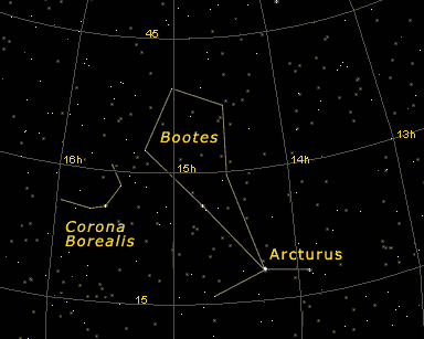ARCTURUS – vrlo sjajna zvezda, sjaja oko nulte zvezdane velicine. Arcturus, sija na prolecnom nebu severne hemisfere. Ovo je Alfa zvezda sazvezdja Bootes. Arcturus je najsjajnija zvezda severne hemisfere, a u sustini to je 4 zvezda po sjaju na celom nebu – odmah iza Sirius-a, Conopus-a i Alpha Centauri. Arcturus, ili kako ga drugacije nazivaju “Cuvar medveda”, prati Velikog Medveda (Ursa Major) oko pola. Rec “arktos” na grckom znaci medved, odakle i potice ime ove zvezde. Zvezda je od nas udaljena 37 svetlosnih godina. Arcturus je klasicna narandzasta zvezda i temperatura joj se procenjuje na 4300 K. Ako uracunamo i zracenje u infracrvenom delu spektra sjaj ove zvezde je onda 180 puta veci od sjaja Sunca, a odatle dobijamo da je njen precnik 24,5 puta veci od precnika Sunca, oko ¼ orbite Merkura. Arcturus je dovoljno veliki i nalazi se dovoljno blizu pa mozemo da merimo i njegov ugaoni precnik (angluar diameter) i on iznosi 0,0191 lucnih sekundi, a to nam takodje potvrdjuje i procenjen precnik ove zvezde. Brzina ove zvezde je nesto veca od brzine drugih sjajnih zvezda, a ona takodje pripada nesto starijoj populaciji zvezda nase galaksije. Arcurus se nalazi u stadijumu dzina, i njena masa je 1,5 puta veca od mase Sunca. U ovoj zvezdi je prestala fuzija vodonika u jezgru. Zbog toga sto je ona nesto sjajnija nego sto ocekujemo, smatra se da je na ovoj zvezdi fuzija helijuma u ugljenik vec pocela.