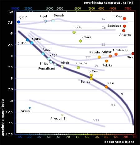 1 2 3 4 5 6 7 8 9 10 11 12 13 14 15 16 17 18 > 5. Hercšprung-Raselov dijagram Razvoj spektroskopije krajem XIX veka omogućio je sistematsko proučavanje zvezda zahvaljujući analizi svetlosti koja je emitovana sa njihove površine. Tako su 1912. godine E. Hercšprung i H. Rasel mogli da, nezavisno jedan od drugog, nacrtaju čuveni dijagram koji danas nosi njihova imena. Ako kao parametre uzmemo boju i magnitudu, zvezde će se grupisati na pravilan način i takav dijagram se naziva Hercšprung-Raselov dijagram (skraćeno H-R dijagram). Držeći se iste ideje, može se dobiti sličan dijagram menjenjem koordinatne ose, na primer, boja se može zameniti spektralnim tipom ili temperaturom, a magnituda (apsolutna ako proučavane zvezde nisu na istoj udaljenosti) bolometrijskom luminoznošću. Fizički najrelevantniji H-R dijagram je nesumnjivo onaj koji se dobija kada se na apcisu nanesu efektivne temperature, a na ordinatu bolometrijske luminoznosti. Najuočljivija karakteristika jednog takvog dijagrama je postojanje glavnog niza. Duž te linije luminoznot i efektivna temperatura su funkcije mase – to je relacija masa-sjaj: L≈Mn , n=3-4. To je drugo fundamentalno svojstvo. Iznad glavnog niza, tamo gde je, za datu temperaturu, luminoznost najveća, nalazi se još jedno, gotovo vertikalno, grupisanje zvezda – to je grana džinova. Na svim drugim mestima zvezde su raspršene. U gornjem delu nalaze se superdžinovi (hladni ili topli, vrlo sjajni), a na levoj strani i u donjem delu beli patuljci (vrlo topli i slabog sjaja).
