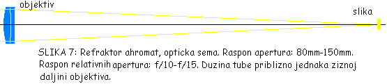 Vise nego bila koja druga vrsta teleskopa u ovom pregledu, refraktor ahromat je ogranicen u velicini kvalitetne aperture koju moze da dostigne, a time direktno u svetlosnoj i razdvojnoj moci. Razlog je, naravno, hromatska aberacija - osobina ovih objektiva da razdvoje belu svetlost i fokusiraju razlicite boje u razlicite fokuse. Ako hromatska aberacija predje odredjeni nivo, slika postaje upadljivo obojena vestackim bojama (sto je manje zlo), dok se kvalitet i kontrast sve vise gube. Nivo hromatske aberacije se smatra prihvatljivm za objektive sa relativnom aperturom (D/f) manjom od 8/D(mm), i zanemarljivom kada je D/f manje od 5/D(mm). Posledica toga je da ovi teleskopi imaju vrlo dugacke tube u poredjenju sa precnikom objektiva, i da potrebna duzina tube raste sa kvadratom aperture. Ovo postavlja prakticnu granicu velicine aperture negde oko 150mm. Naravno, moguce je napraviti, i prave se ahromati sa vecim relativnim otvorima (kracim tubama), ali cena toga je nizi kvalitet slike. U pogledu kontrasta slike, sve dok se hromatska aberacija drzi pod kontrolom, ovi teleskopi imaju nekoliko prednosti nad reflektorima i katadioptricima. Jedna je da povrsina sociva zahteva 4 puta manju tacnosti u izradi, za isti nivo kvaliteta, u poredjenju sa povrsinom ogledala. Posto ahromat zahteva 4 opticke povrsine, u poredjenju sa dve ili tri kod reflektora (i 4-5 kod katadioptrika), ocigledno je da je lakse postici visi opticki nivo u slucaju ahromata. Uz to, zahvaljujuci konfiguraciji, ovi teleskopi imaju najnizi nivo nezeljene svetlosti u fokuseru, i u blizini polja slike. Takodje, odsustvo centralne obstrukcije daje dodatnu prednost u nivou kontrasta, posebno u poredjenju sa sistemima koji imaju centralnu obstrukciju oko D/3, ili vecu. Kada se tome doda niza osetljivost na greske u kolimaciji, veca termalna stabilnost, i niza podloznost atmosferskim faktorima (jedna prednost manjih apertura), nije tesko zakljuciti da ovakvi instrumenti imaju prednost u kvalitetu slike u poredjenju sa reflektorima i katadioptricima slicne aperture. Polje slike dubleta ahromata ima poluprecnik zakrivljenosti priblizno jednak f/3 (trecina zizne daljine objektiva), sto je znatno vise nego u Newton reflektoru, ali bolje nego u i u kompaktnim Cassegrain sistemima. Takodje, polje slike ima zanemarljivo niske zonalne aberacije. Medjutim, zbog nivoa defokusa crvene, plave i posebno ljubicaste svetlosti (na koje je oko mnogo manje osetljivo nego fotografska emulzija), celokupna slika refraktora ahromata nije ni priblizno tako kvalitetna za fotografske svrhe, kao sto je za vizuelna osmatranja. Tome se pridruzuje nedovoljna fotografska brzina zbog malih relativnih apertura. Udobnost osmatranja je osrednja, zbog dugih tuba. Sa druge strane, zahtevi odrzavanja su sasvim minimalni. Cena ovakvog instrumenta (sa montazom) je blizu dva puta veca od cene ekvatorijalnog Newton teleskopa, i priblizno na nivou cena katadioptrika iste aperture.