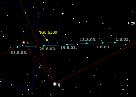 Da bi se video asterid Victoriu neophodna je noć bez mesečine i skiciranje svih bledih zvezda na mestu gde se asteroid nalazi. Pošto asteroid ima sjaj kao i blede zvezde, povratak istom delu neba nakon dve ili tri noći i novo skeniranje će pokazati jednu od "zvezda" koja se pomerila. Ta "zvezda" je asteroid 12 Victoria. Poseban dogadjaj osmatranja ovog asteroida će se dogoditi 24-og avgusta kada će asteroid proći neposredno ispod planetarne magline NGC 6309 koja je poznatija pod imenom Kutija (The Box). NGC 6309 je 11,5 mag. objekat u sazvežđu Zmijonoše i potrebno je uvećanje od najmanje 150 x ili jače da bi se imao dobar pogled na maglinu i asteroid. ************** METEORI JUŽNI JOTA AQUARIDI Prva od avgustovskih meteorskih kiša sa vrhuncem 5-og avgusta i maksimumom od oko pet meteora na sat. Brzina ovih meteora je 34 km/sek i aktivni su od sredine jula pa sve do kraja avgusta. SEVERNI DELTA AQUARIDI Vrhunac ove meterske kiše je u noći 12-og avgusta. Kao i na mnogo poznatije Perseide sledeće noći i na ove meteorite će uticati sjaj punog Meseca. Pogotovu što je ovo veoma slaba meteorska kiša sa prosekom od dva do pet meteora na sat. Njihova brzina je oko 42 km/sek. PERSEIDI Mesec je jedan dan nakon punog u jutro 13-og avgusta, pa će to umnogome uticati na osmatranje maksimuma ovogodišnjih Perseida. Perseidi veoma variraju iz godine u godinu. Ponekad se desi da se u isto vreme pojave dva meteora iz različitih pravaca pošto je aktivno nekoliko meteorskih kiša iste noći. Ovo može stvoriti konfuziju kod svih, osim kod najiskusnijih osmatrača. Ponekad je jako teško ustanoviti kome zapravo pripada upravo viđen meteor. Radijant Perseida se nalazi na pola puta između sazvežđa Perseja i Kasiopeje. KAPPA CYGNIDI Ovi meteri su vidljivi od druge nedelje u avgustu pa sve do ranog oktobra. Brzina im je oko 26 km/sek, a maksimalni vrhunac u noći 18-og avgusta. SEVERNI JOTA AQUARIDI Sa maksimalnim periodom u noći 20-og avgusta, ovi meteori imaju brzinu od 31 km/sek i vizuelno su veoma slabi. Aktivni su od sredine jula pa do sredine septembra.