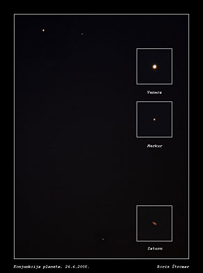 27.06.2005. Ok, dakle svi znate priču - Merkur, Venera i Saturn se ovih dana skupljaju vrlo blizu jedan drugome, nisko na zapadu nakon zalaska Sunca. Mi ADIjevci smo nakon dugo vremena napravili javno promatranje. Bilo je sramežljivo najavljivano u medijima (radio, net), a čak su došli i iz Večernjeg i poslikali nas dok smo promatrali sa nasipa na Jarunu u subotu. Druženje u subotu je bilo simpatično, puno članova društva i nekih lica sa newsgrupe..nažalost, zbog oblaka je većina ostala razočarana, uključujući mene. Golim okom smo vidjeli Veneru, kroz teleskop smo skužili Merkur, ali Saturn nismo uspjeli naći :( Oblaci i mutna atmosfera su onemogućili potpuni vizualni doživljaj. Malo smo promatrali Jupiter, međutim niti on zbog turbulencija nije mogao puno toga pokazati.