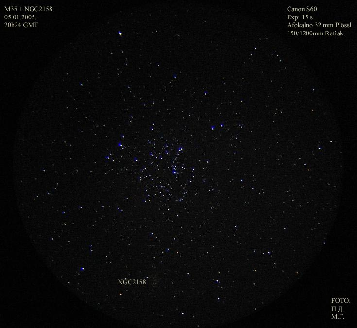 Još pre mesec dana, kad smo Milan Gucić i ja bili na Avali, Milan me je huškao da pokušam da napravim sliku nekih objekata dubokog neba sa svojim novim digitalnim aparatom, (Canon S60). Ubeđen da neće ništa interesantno ispasti, nisam bio nešto naricito entuziastičan, ali sam ipak napravio pokušaj: rezultati su, za moje pojmove, bili iznenađujuće dobri. Ako su podatci iz Starry Night Pro-a za poverovati, na nekim snimcima se čak vide zvezde do 14. veličine. Sve slike su napravljene afokalnom projekcijom kroz moj refraktor (150/1200mm) sa maksimalnom ekspozicijom od 15 sekundi i najširom blendom, (f/2.8). Priložio sam neke od boljih slika napravljenih na Avali (05.01.2005.) i na kasnijem posmatranju sa Suvobora (08.01.2005.). Foto: Pavle Doroslovački & Milan Gucić Kliknite na snimak