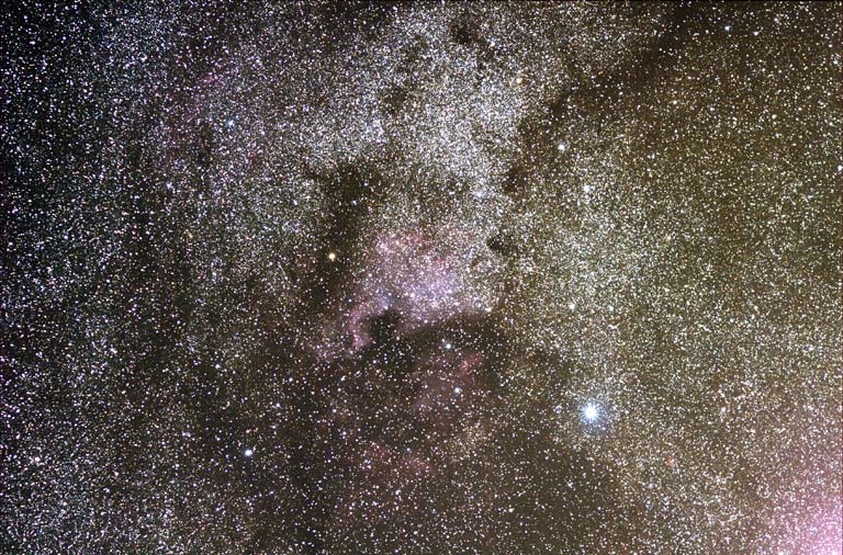 23.01.2008. Ponovo sam obradjivao M31 snimljen 15./16. oktobra 2007. Stekirano je, ponovo u DSS-u, ali sa drugacijim podesavanjima, 9x120sec snimaka. Ovaj put su u stekiranje ukljuceni i dark frejmovi (20) kao i bias/offset (10). Kao sto sam vec prosli put naveo, radi se o snimcima nacinjenim sa Fruske gore Canonom 20D sa 1.8/105mm objektivom, ISO1600 i blenda 4, sve na Synta HEQ5 bez kontrole pracenja. Posle stekiranja u DSS, obrada je nastavljena u PS CS2. Ovo je snimak kojim vec, koliko toliko mogu biti zadovoljan. Snimak je, naravno, na kraju kropovan. Prilazem i jos jednom obradjivan region Severna Amerike, bez veceg kropovanja. Nisam otklanjao ni "ampglow", koji je ostao i pored 20 dark-frejmova. Ovde jos nisam zadovoljan. Crvenu boju NA i okolnih maglina