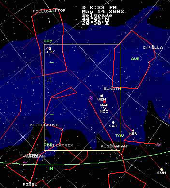 Od 'teške' i 'specijalne' opreme korišćeni su stativ i žičani okidač. Sa vremenom ekspozicije sam morao da eksperimentišem u širokim granicama. Posle zalaska sunca osvetljenje i uslovi za snimanje se vrlo brzo menjaju, sa druge strane trebalo je zadovoljiti vrlo različite zahteve. Količina svetla na horizontu je zahtevla kraće vreme ekspozicije. Saturn koji se krio u oblacima je mogao lako da se 'izgubi' u okolnom svetlu, i trebalo bi sačekati još malo da nebo postane tamnije. Situacija sa oblacima se menjala dosta brzo i Saturnov skori zalazak su ograničavali raspoloživo vreme. Mars i planete koje su bile visoko na nebu koje je već postalo znatno tamnije, bile bi bolje i sa dužim vremenom osvetljenja. Ukupno je načinjeno desetak snimaka i od kojih su neki skoro neupotrebljivi. (mart 2004.)