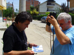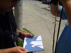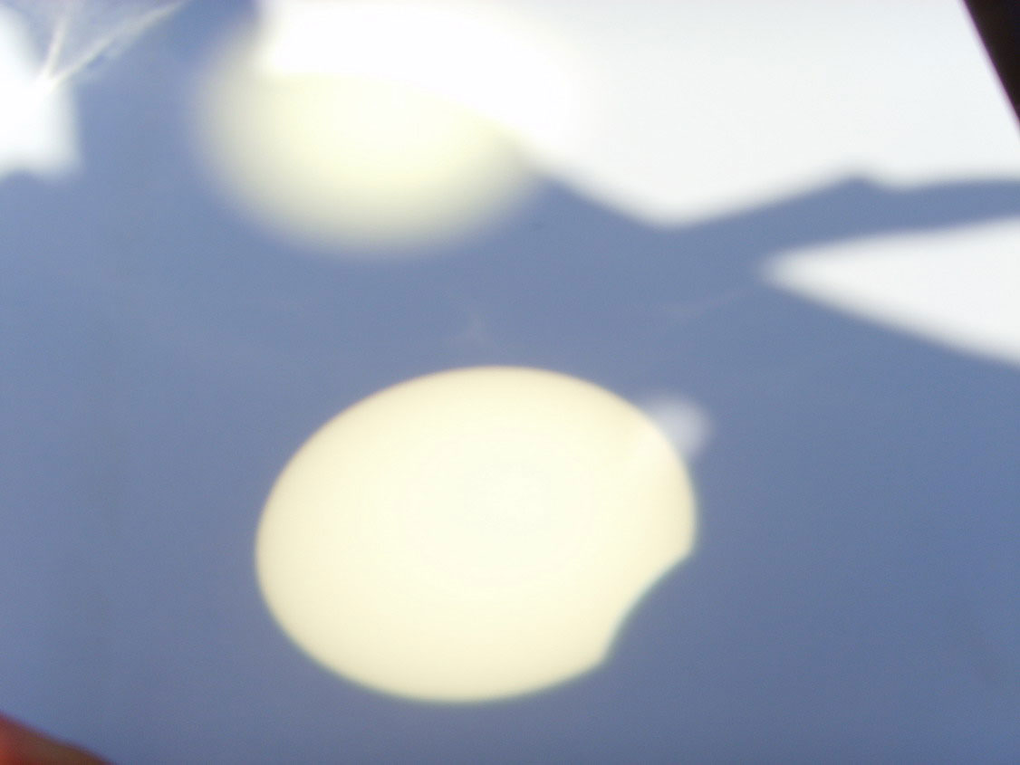 Skoplje 1. avgusta mi je bio jedan od onih dana kada jedva imaš vremena i da dišeš a kamoli nešto saglam da završiš kako treba. Naime tog dana je trebalo da počne naš astrovikend koji se već skoro mesec dana najavljuje na sva zvona. Imalo smo veliki broj ljudi pa i ljude iz inostranstva koje je trebalo sačekati i ugostit. Među prvima je stigao Dragan Radmilović iz Beograda i dok smo odmarali kod mene baš negde oko podneva smo izašli ispred moje zgrade i sa dvogledom koji sam imao u kolima smo napravili projekciju dok nas je moja kći Maja slikala. Svi naši teleskopi su bili spakovani kod Dejana u pikap i nismo ni mogli stići do njih. Ipak smo naočarima koje sam doneo sa poslednjeg pomračenja u Turskoj pre dve godine uživali u delimičnom pomračenju Sunca koje je iz Skoplja gledano bilo manje od 10%. Bilo kako bilo ipak smo uspeli da zabeležimo i ovaj fenomen, pa makarkako i to izgledalo uz pomoć štapa i kanapa.