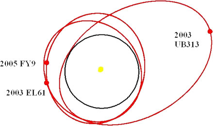 Šta je 2003 EL61?(136108) 2003 EL61 je objekat Edgeworth–Kuiperovog pojasa (EKO), dela vasione koji se prostire 30–50 A. J. iza Neptuna i u kome su smešteni veliki asteroidi (50000) Quaoar i (90482) Orcus, (136472) 2005 FY9, najveća planeta patuljak (136199) Eris (ranije poznata kao 2003 UB313), i mnogi drugi. U vreme otkrića, 2003 EL61 je bio treći najsjajniji objekat u tom delu svemira, odmah posle Plutona i 2005 FY9. Zapravo, toliko jako sija da ga je moguće posmatrati čak i jakim amaterskim teleskopima opremljenim CCD kamerama. Pored toga, 2003 EL61 predstavlja jedan tipičan EKO, koje astronomi nazivaju "raspršenim objektima Kajperovog pojasa". Nazivaju se tako, jer se smatra da su nekada u prošlosti svi oni imali "bliske kontakte" s Neptunom, čija gravitacija ih je sve raspršila po jako ekscentričnim orbitama. To se najbolje vidi ako uporedimo orbite tri relativno skoro otkrivena EKO: 2003 EL61 i 2005 FY9 imaju slične ekscentrične orbite, koje su nagnute za oko 30° u odnosu na ostatak Sunčevog sistema. "Deseta planeta", (136199) Eris, ima još ekscentričniju orbitu i nagib od preko 44°. Crna kružnica na slici predstavlja orbitu džinovskog Neptuna. U ovoj razmeri, Zemljina orbita bi bila unutar žutog kruga koji ovde predstavlja Sunce!