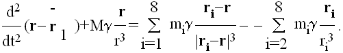 gde je M- masa Sunca, r-vektor položaja tela, a sumiranje se vrši po devet velikih planeta7 i povećanju njihovih srednjih udaljenosti od Sunca (koordinatni početak je uzet u centru Sunca), pri čemu i=1 odgovara Merkuru itd. Osim ako telo ne prolazi blizu neke planete, najveći doprinos desnoj strani jednačine (11) potice od Jupitera, m5, dok su efekti ostalih planeta relativno mali. Ova aproksimacija proizilazi iz činjenice da je najveći broj asteroida skoncentrisan na lokaciji tzv. Glavnog asteroidnog pojasa, ilustrovanoj na slici 7, koji se proteže izmedju orbita Marsa i Jupitera. U slucaju transneptunskih asteroida, najveći doprinos desnoj strani jednačine (11) potiče od Neptuna i tako dalje, u zavisnosti od konkretnog problema. Sledi da je u praksi i neophodno i moguće pojednostaviti (11), s tim što je svaki korak potrebno teorijski potkrepiti. Uticaj Plutona se može sasvim zanemariti zbog njegove male mase (nekoliko redova veličine manje od mase velikih spoljašnjih planeta) i velike udaljenosti. Ovo nije slučaj kod Merkura gde se indirektni članovi u (11) ne mogu zanemariti; oni imaju oblik: