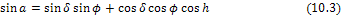 U trenutku svitanja (kao i sumraka) Sunce je na horizontu, visina Sunca nad horizontom (a) je nula, a zenitna daljina ZX je 90o. Časovni ugao Sunca je tada h0.