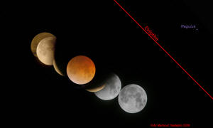Pošto me je prošla euforija prve postprodukcije (i umor posle neprospavane noći :)), evo malo pažljivije obrade, na kojoj sam manjim kropovanjem ostavio da se vidi i Regulus, a ubacio sam i Ekliptiku na koliko sam mogao približan položaj. Dodao sam i još uvek delimično u senci lik Meseca pred sam zalazak... Meni je ova obrada malo bolja, jer je pre svega, serija realnije postavljena u odnosu na horizont, a i Zemljina senka je ubedljivija. Za stekiranje sam koristio francuski besplatni program StarMax, i malo doradio (rotiranje realnije prema horizontu i ubacivanje Ekliptike, slova...) u PS E2. Ostali podaci kao i za prethodnu obradu.